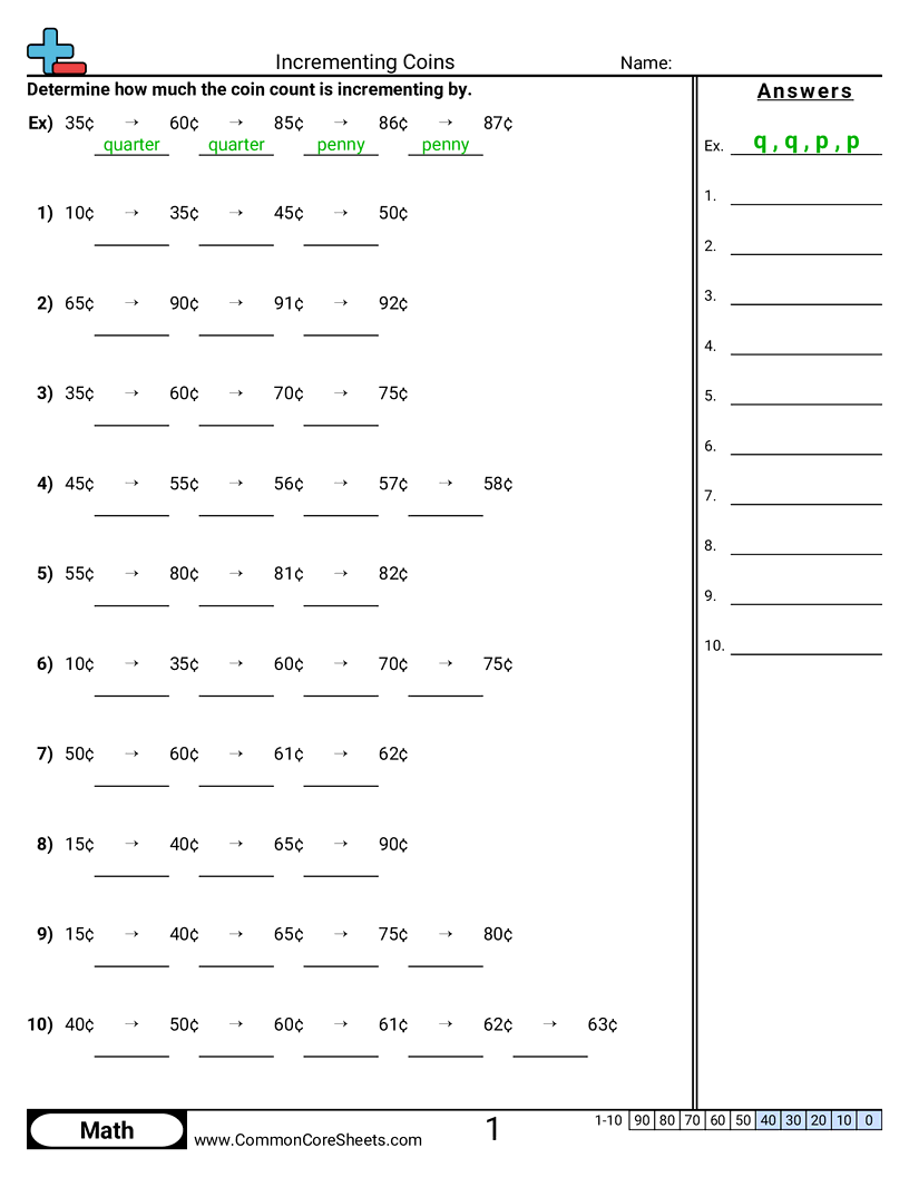 Free math worksheets on Incrementing Coins. Each worksheet has 10 problems with an answer key and are ideal for teachers and homeschooling. You can download the PDF, create a set of flash cards or set it up for online learning.